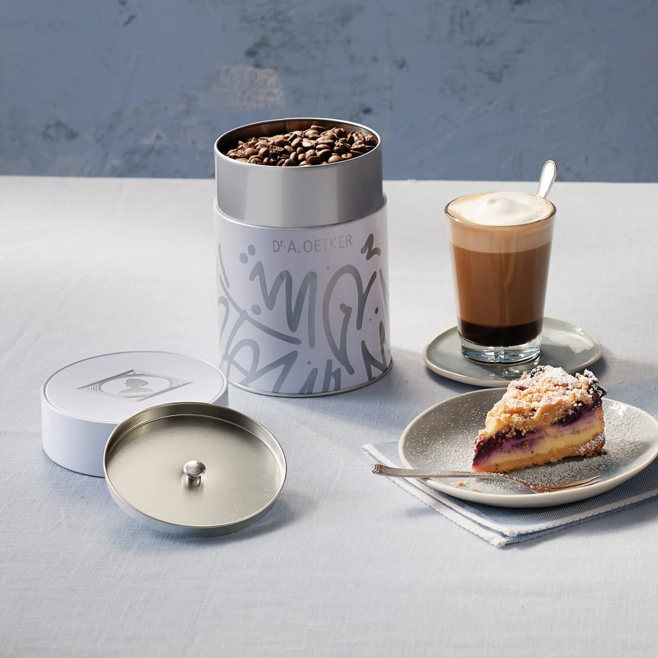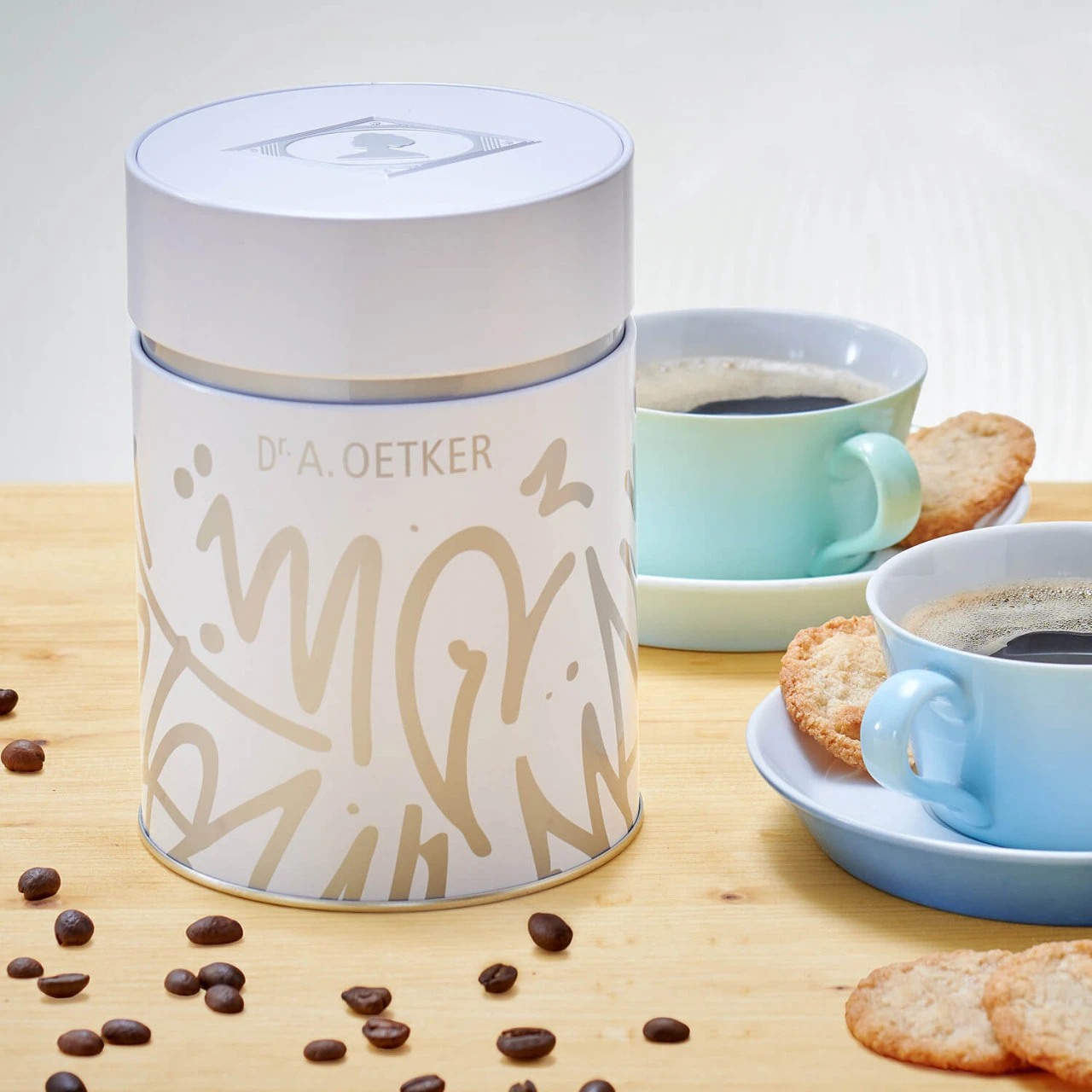 Der Kaffee oder Tee soll endlich schön aufbewahrt werden und dazu noch lange frisch bleiben? Unsere neue Aromadose „weiß-silber“ bietet genau diese Vorteile, verpackt in einem modernen Design mit Graffitischrift und silbernen Details. Das erste Mal wurde das eckige Dr. Oetker Logo aufgegriffen und sorgt, zusätzlich zu der Prägung, für ein Highlight in der Küche. Aber nicht nur das Design spielt eine große Rolle, auch die Funktionalität. Durch den passenden silbernen Innendeckel, ist der Inhalt aromageschützt und bleibt lange frisch. Die Dose fasst zum Beispiel 500g Kaffeebohnen oder 600g Kaffeepulver und ist damit eine stylische Ergänzung, um den täglichen Kaffee zu einem Highlight zu machen.