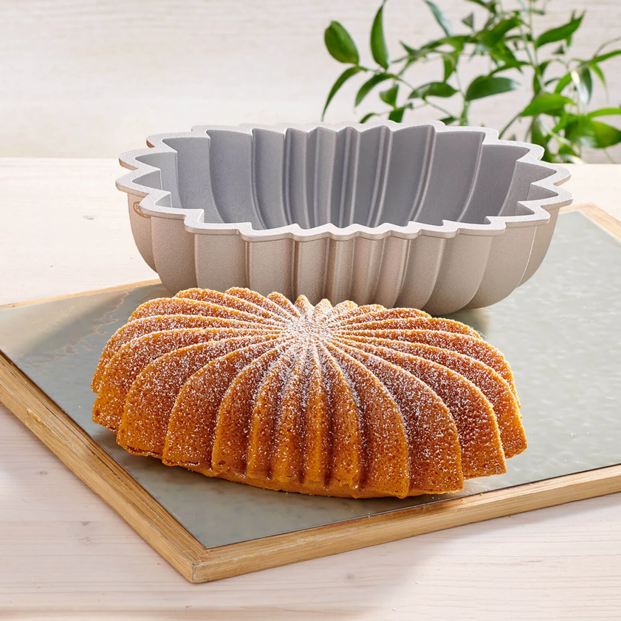Die Backform ist aus Aluminiumguss gefertigt und deshalb besonders stabil, dickwandig und von schwerer Qualität. Aufgrund der sehr guten Wärmeleitung der Form wird der Kuchen gleichmäßig und zügig gebacken. Die Form sorgfältig einfetten und mit etwas Mehl ausstreuen, so kann der Kuchen, dank der ausgezeichneten Antihaft-Beschichtung, mühelos aus der Form gelöst werden. Die Form lässt sich nach Gebrauch ganz einfach per Hand reinigen.