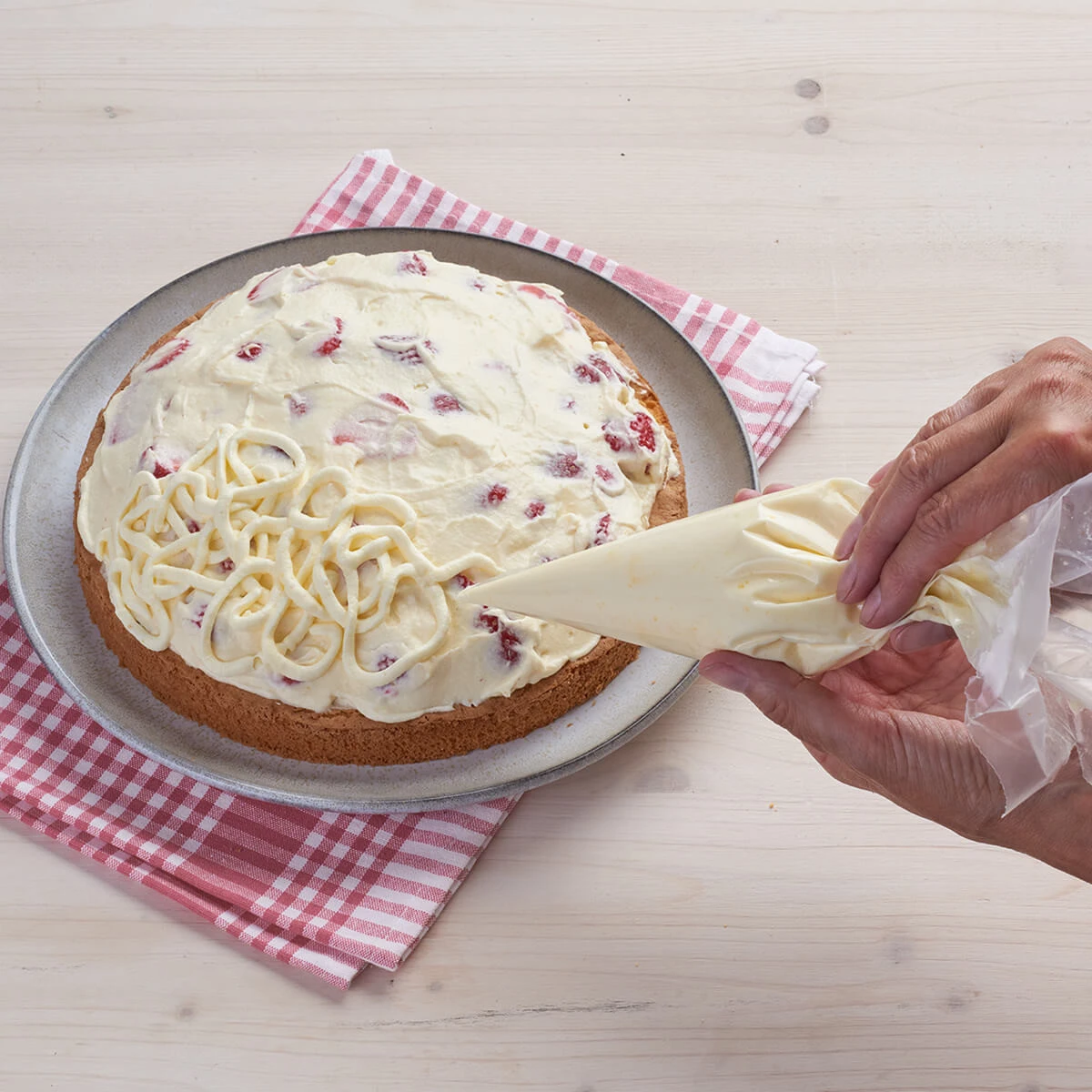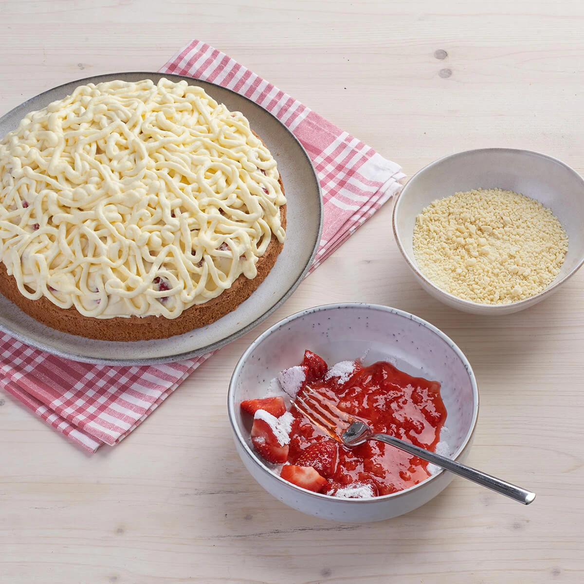 Die Backmischung enthält bis auf frische Zutaten alles, um diesen außergewöhnlichen Kuchen im Handumdrehen zu backen.Die Kombination aus Rührkuchen und Sahnecreme mit Vanille-Geschmack, verfeinert mit frischen Erdbeeren, dekoriert mit Erdbeersoße und weißer Raspelschokolade besticht alle Geschmäcker. Doch auch die Optik, welche an leckeres Spaghetti-Eis erinnert, macht den Kuchen zu einem Highlight.