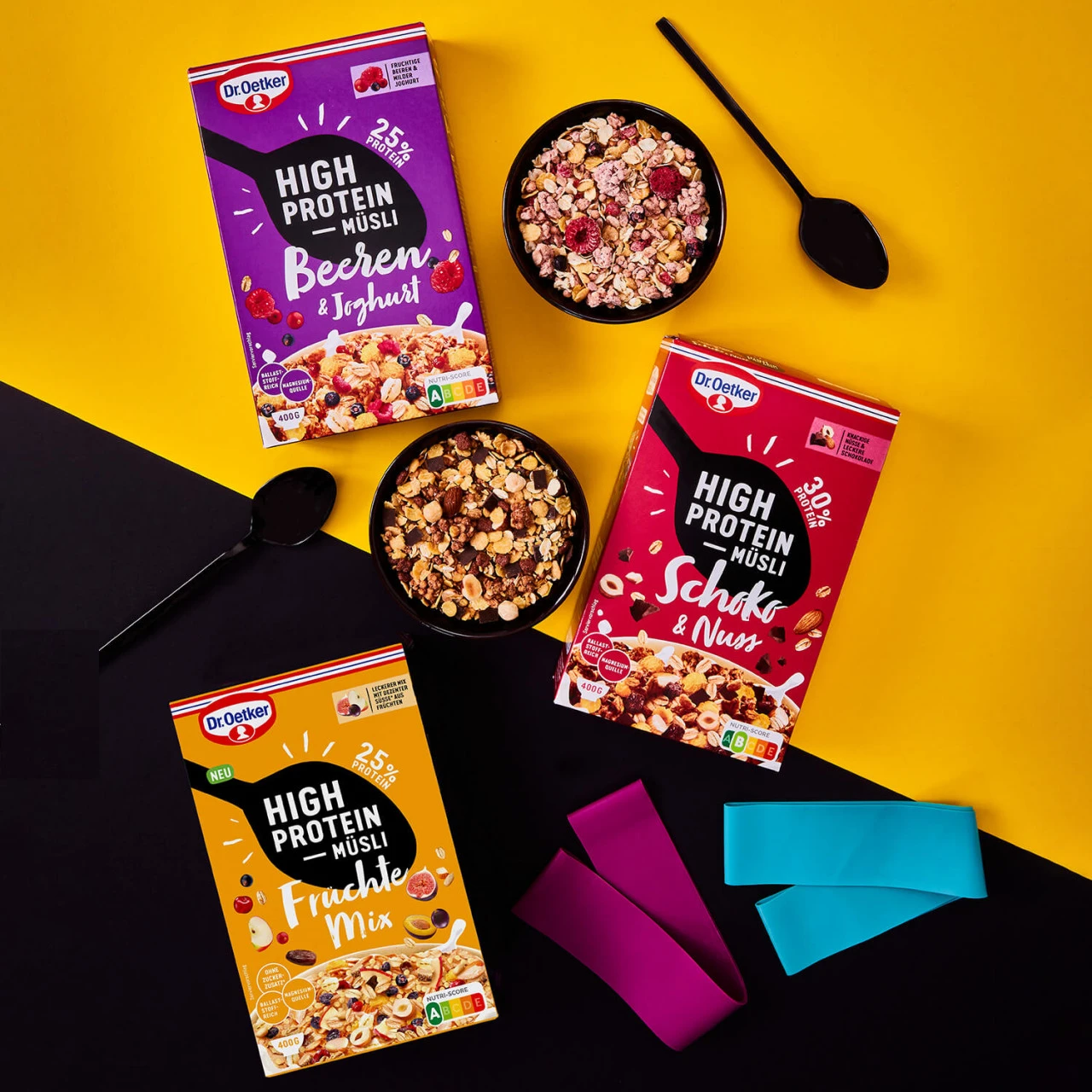 Ob als genussvoller Start in den Tag oder kleiner Snack zwischendurch: das High Protein Müsli Früchte Mix ist die köstliche Kombination aus wertvollen Flocken, 8 leckeren Fruchtsorten und knackigen Nüssen, Mandeln & Kernen. Der Mix an Früchten sorgt für eine dezente Süße, sodass das Müsli ganz ohne zugesetzten Zucker auskommt.Ohne Zuckerzusatz* aber mit 25% Protein, einem hohen Ballaststoffgehalt und Magnesium fügt sich das fruchtige Müsli ideal in den Rahmen einer bewussten Ernährung und eines aktiven Lifestyles ein.