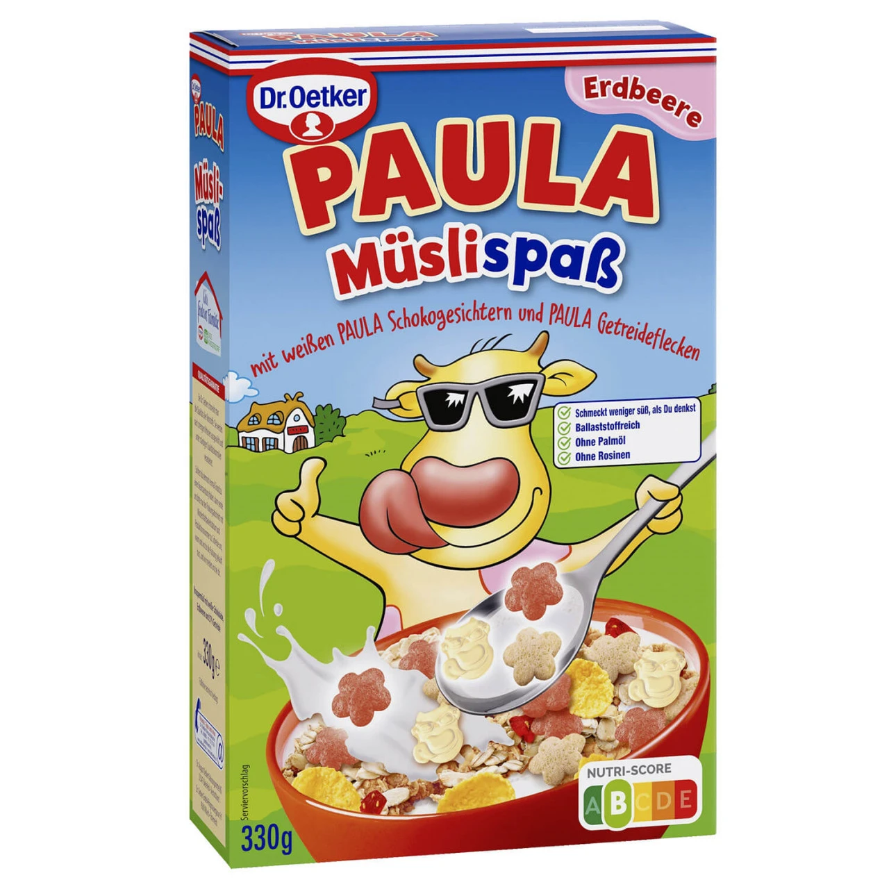 Der Dr. Oetker PAULA Müslispaß gibt es nun auch in der beliebten Geschmacksrichtung Erdbeere und überzeugt die ganze Familie mit kuhlen PAULA-Schokogesichtern aus weißer Schokolade, leckeren Erdbeerstückchen & hellen sowie rosa-roten Getreideflecken. In Kombination mit unserem leckeren Knuspermüsli als Basis bietet es ein spaßiges Knuspererlebnis und schmeckt dabei weniger süß, als man denkt und ist außerdem besonders ballaststoffreich. PAULA Müslispaß – ein echtes Highlight auf dem Frühstückstisch!