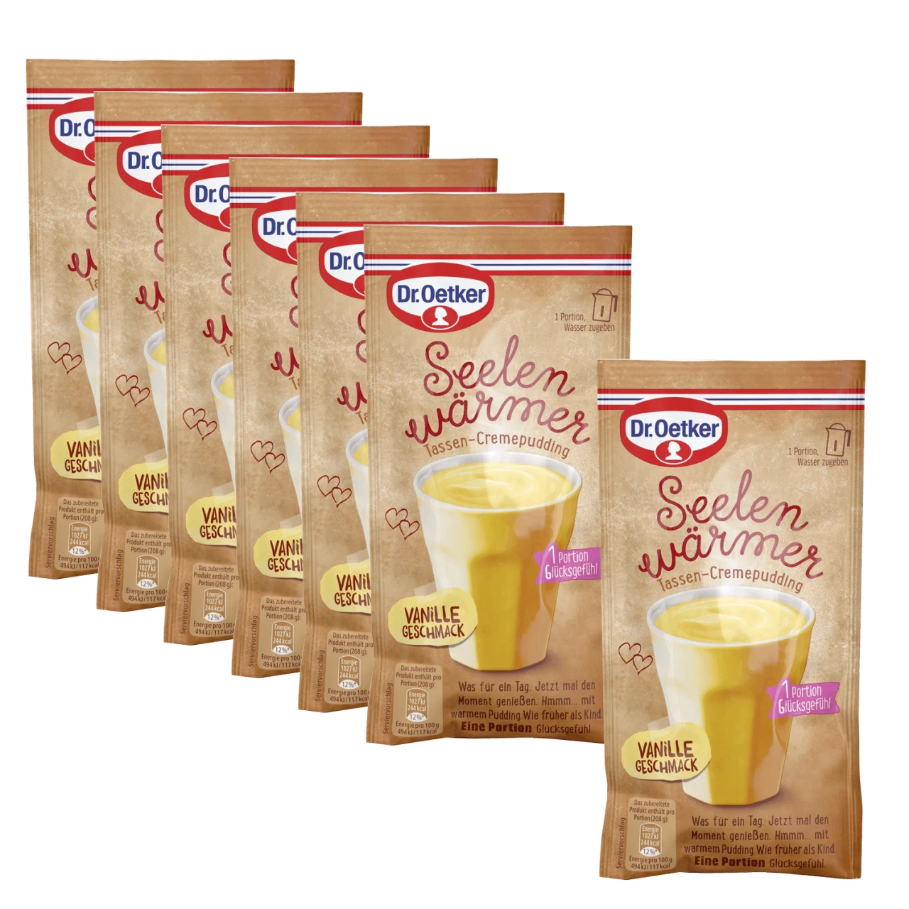 Der Dr. Oetker Seelenwärmer 1-Portion Cremepudding Vanille-Geschmack schenkt durch die reichhaltige Rezeptur, den cremig-vollmundigen Geschmack und die warme Zubereitung echte Verwöhnmomente und das gute Gefühl von Glück und Geborgenheit.Einfach das Puddingpulver in einen leeren Kaffeebecher (ca. 300 ml Inhalt) geben, den Becher mit sprudelnd kochendem Wasser (150 ml) zu 2/3 füllen, und sofort kräftig verrühren, bis alles, auch am Becherboden, gelöst ist. Den Pudding am besten lauwarm genießen.Auf diese schnelle Weise bietet Dr. Oetker Seelenwärmer das einfachste Rezept für den spontanen, warmen Puddinggenuss in 1 Portion.