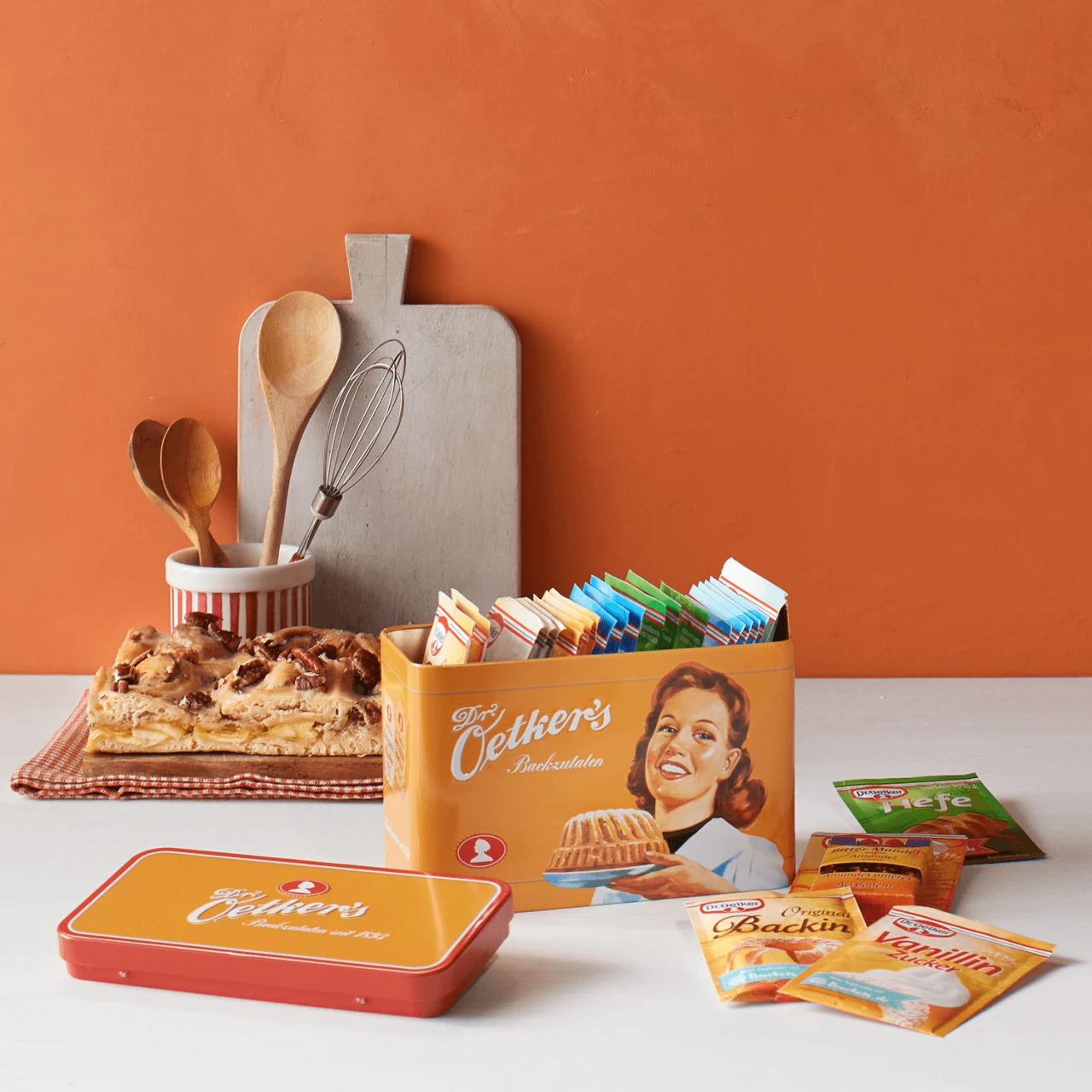 Die beliebte Aufbewahrungsdose Backzutaten jetzt auch in klein! In der Vintage-Dose “Backzutaten klein“ lassen sich Vanillinzucker, Backin und die Aromen optimal lagern, ohne viel Platz wegzunehmen. So hat die ewige Sucherei im Backschrank endlich ein Ende und die Dr. Oetker Backzutaten sind an einem Ort. Wie auch bei der großen Schwester, hat die Dose ein warmes Orange als Grundton. Außerdem ist sie aufwändig geprägt und zeigt nostalgische Motive aus der Werbehistorie.