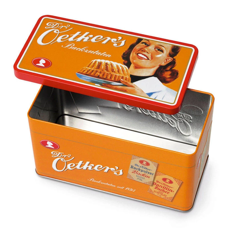 Ein warmes Orange als Grundton und die aufwendige Prägung an Rumpf und Deckel mit nostalgischen Motiven aus der Werbehistorie von Dr. Oetker Vanillin-Zucker und Dr. Oetker Backin machen sich gut in jeder Küche.